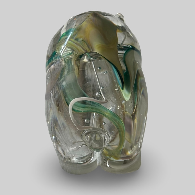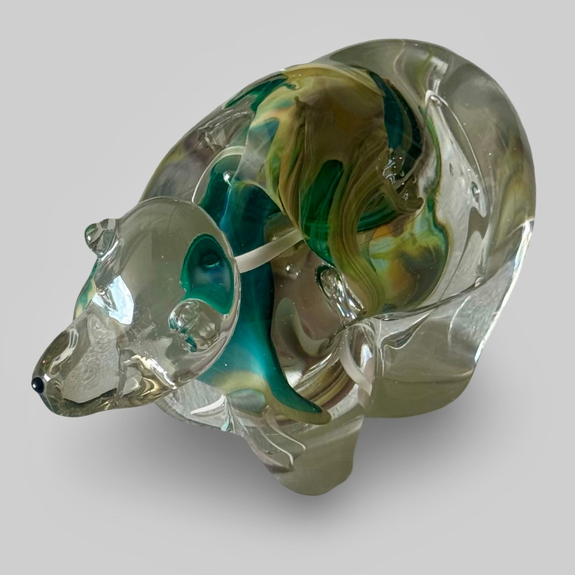 This sculpted glass bear blends warm vanilla and deep teal, balancing elegance and quiet strength. Its intentional contours and luminous light create a poised, timeless presence—both grounded and ethereal, a serene study in colour and form.