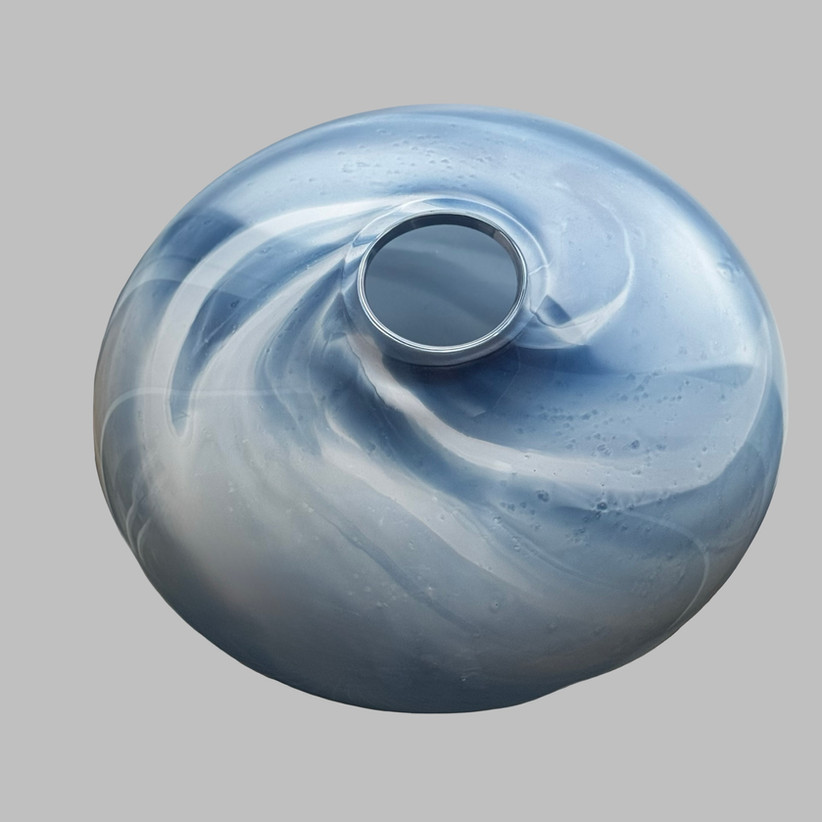 This blown vessel swirls with blue and white, evoking the crisp whisper of a cool breeze or a gentle touch of winter.
