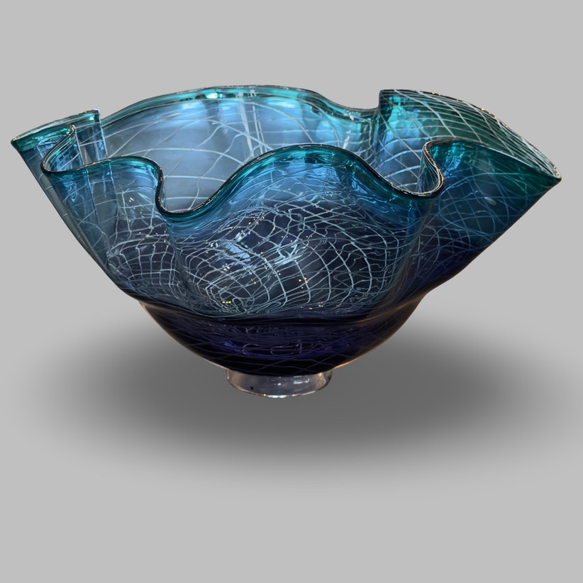 A graceful blend of texture and tone, this unique piece features delicate white-cane work and flowing shades of purple and teal. A blown glass bowl reflecting how design and technique can prove timeless.