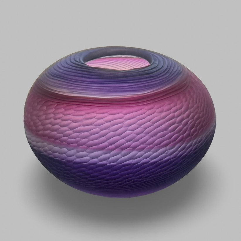 This textured blown bowl celebrates floral beauty with delicate patterns in soft pink and rich purple. The muted pink unfolds like blooming petals, adding warmth and softness, while deeper purple accents bring depth and a regal touch. The vibrant yet harmonious palette and matte finish creates a bowl alive with natural grace and lasting charm.